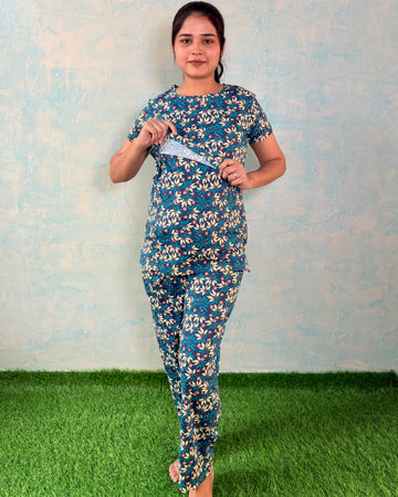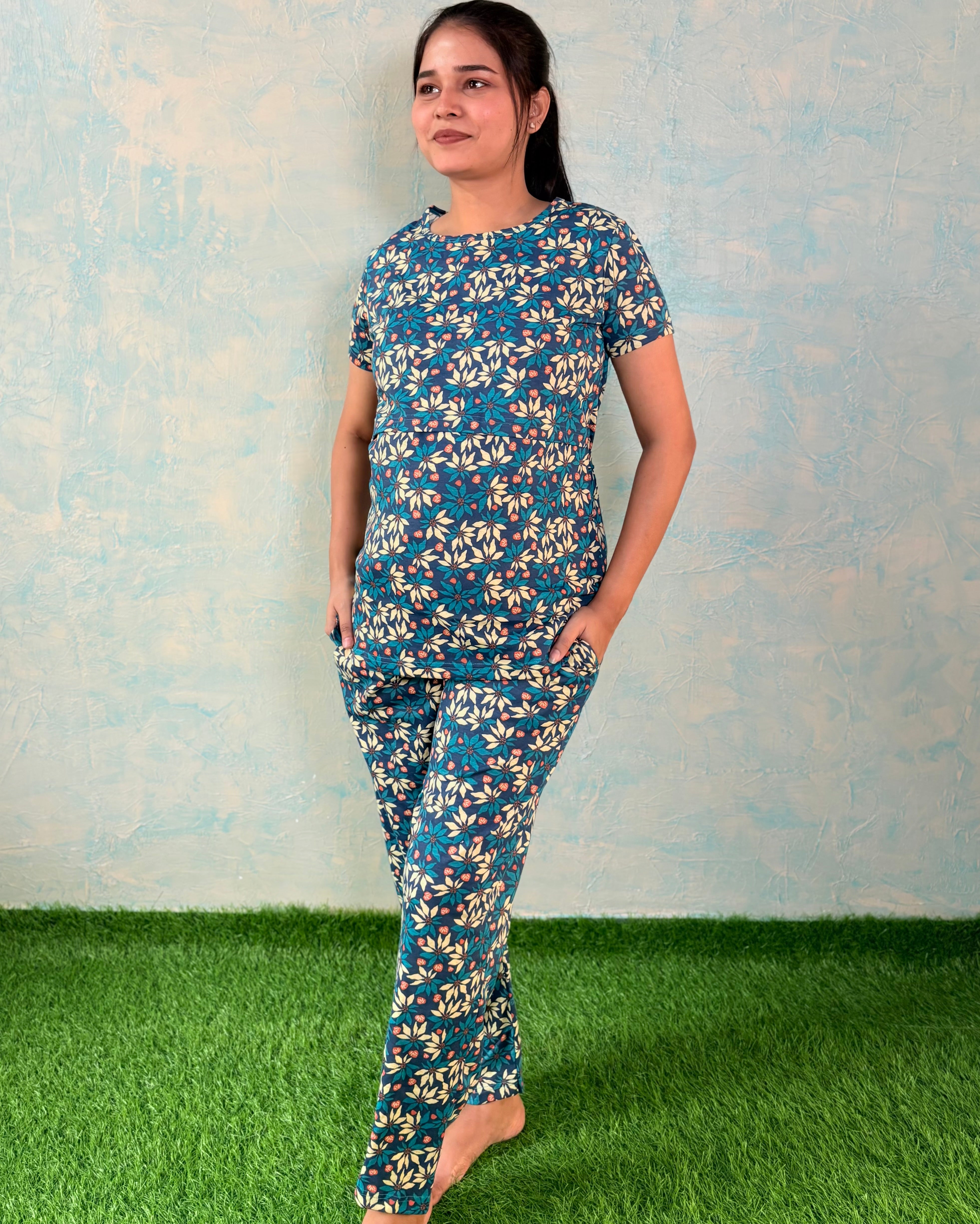 Our 2 piece Zipless Maternity and Feeding (t-shirt & pant) set is designed for the modern mom who values both comfort and style during pregnancy, postpartum, and while nursing. The zipless design makes it easy to pull over and off, while the discreet nursing access ensures you can feed your baby comfortably with privacy. Comes with an adjustable rope knot and side pocket for mobile.