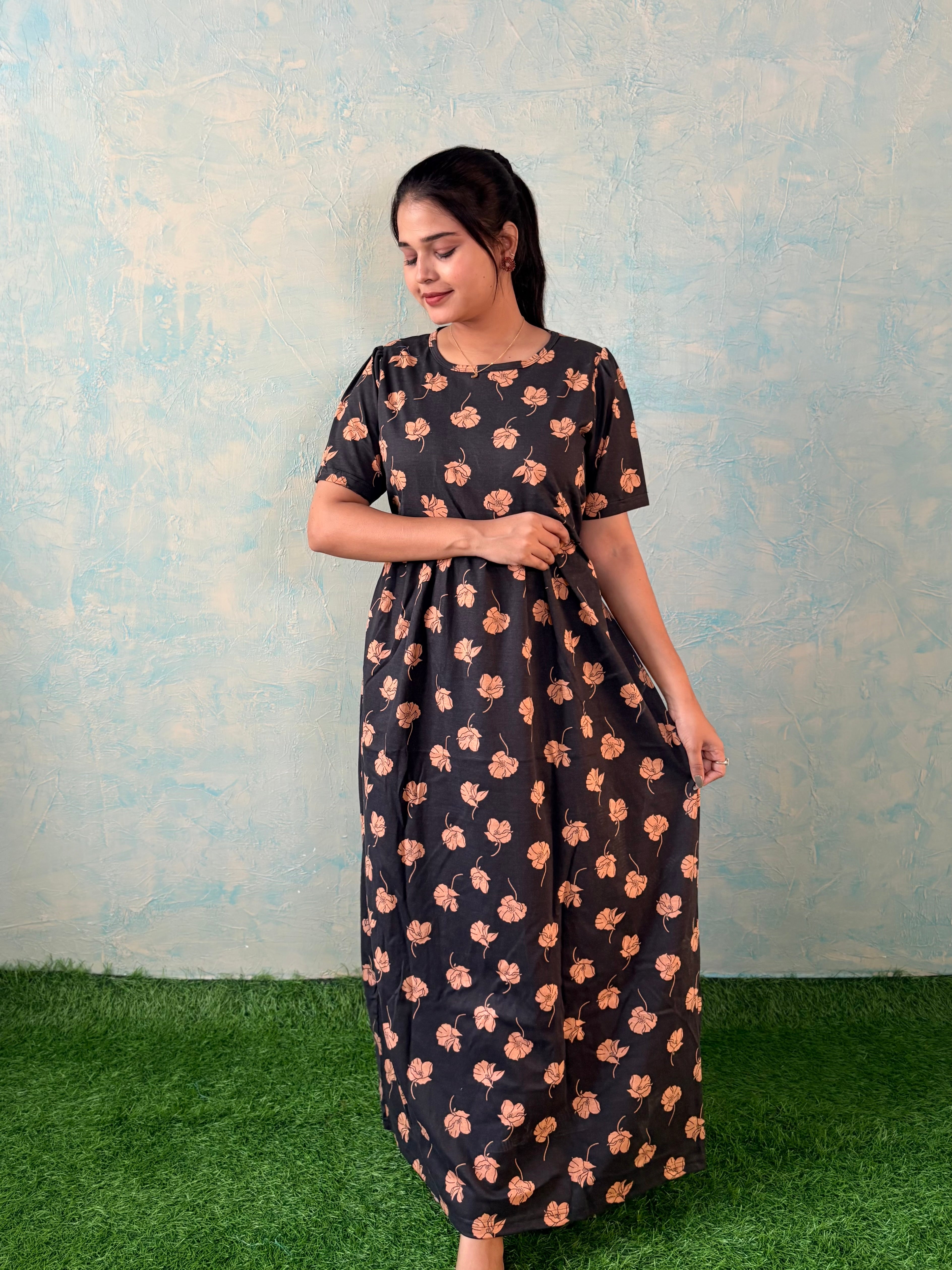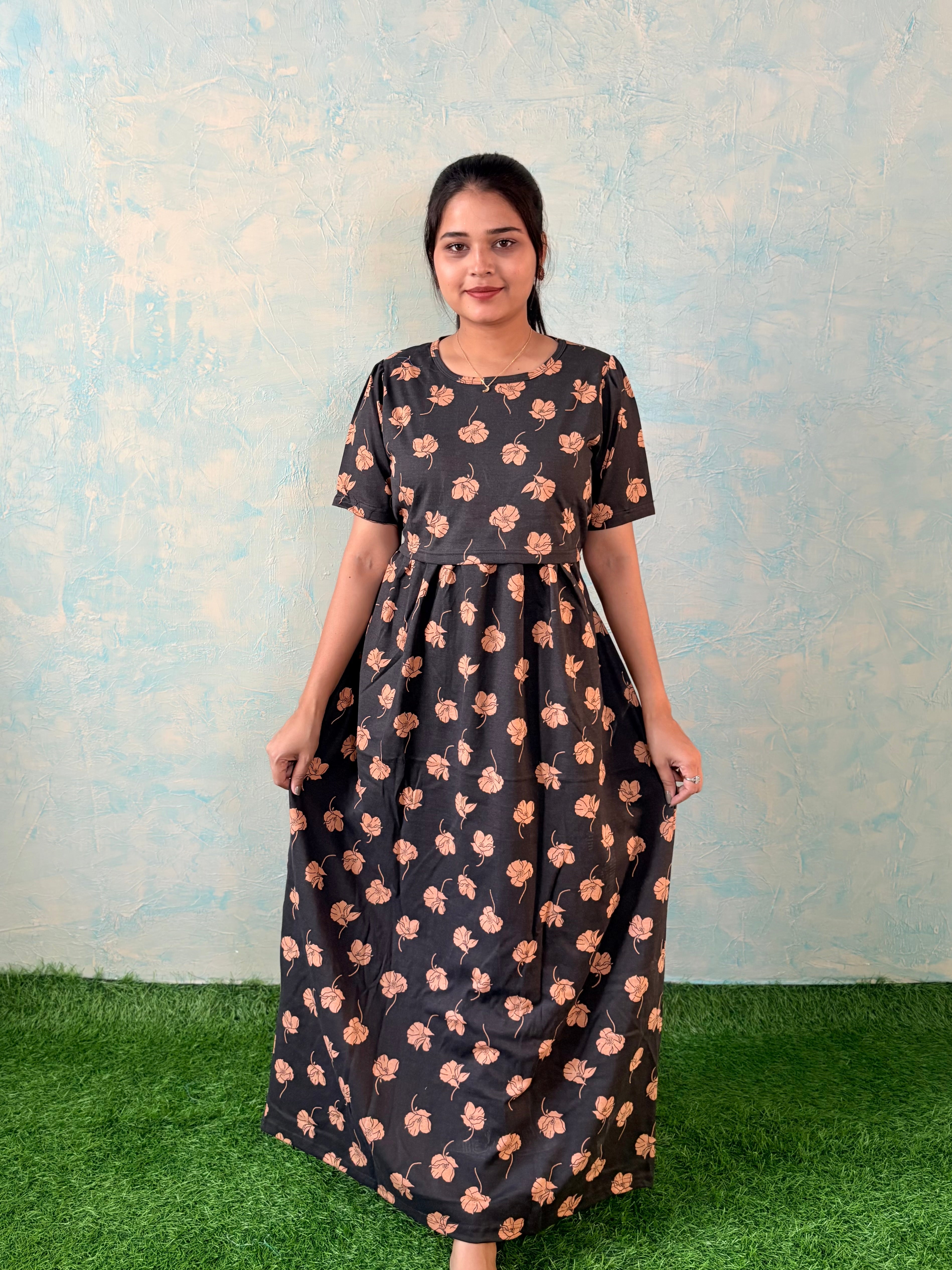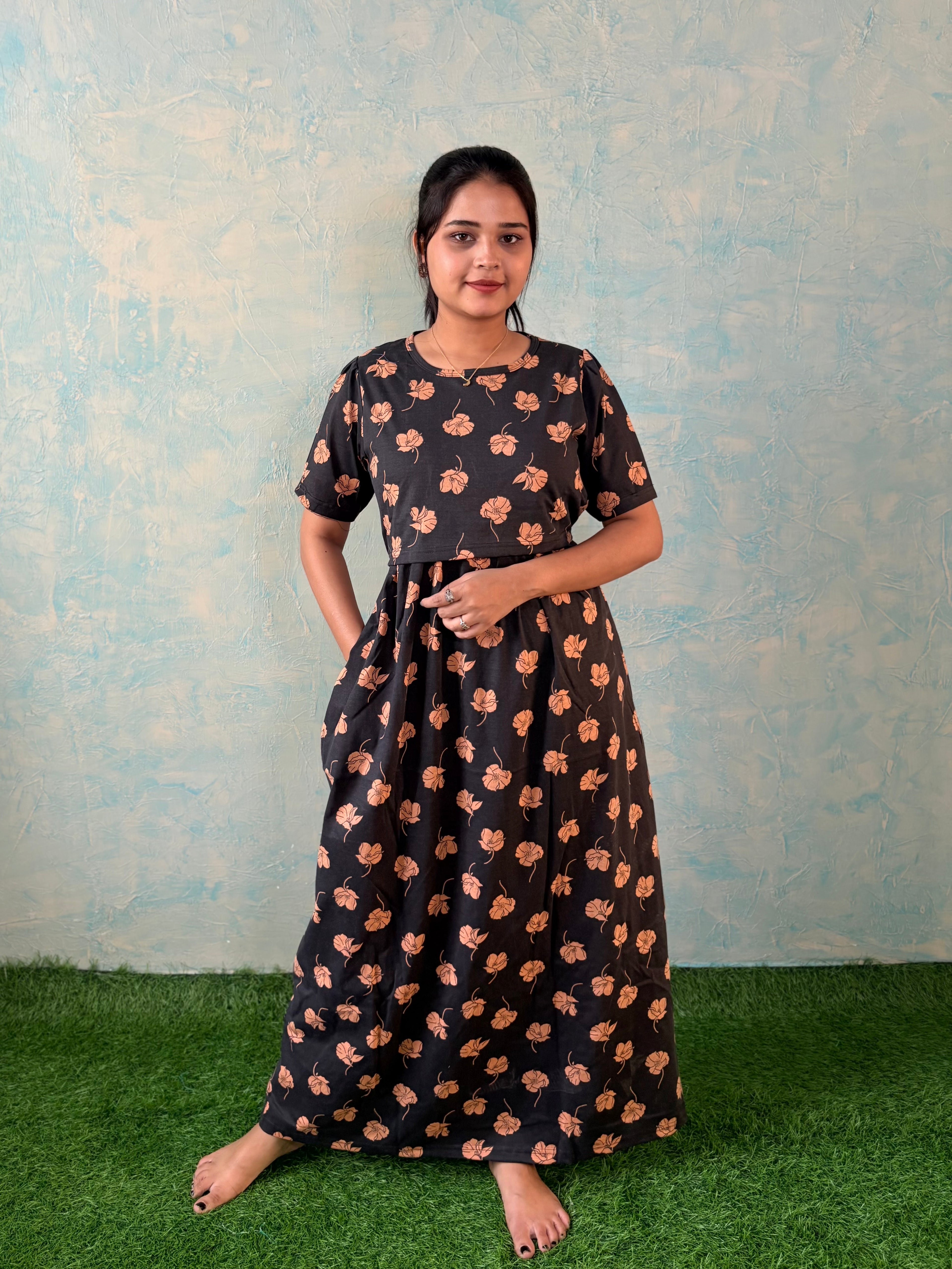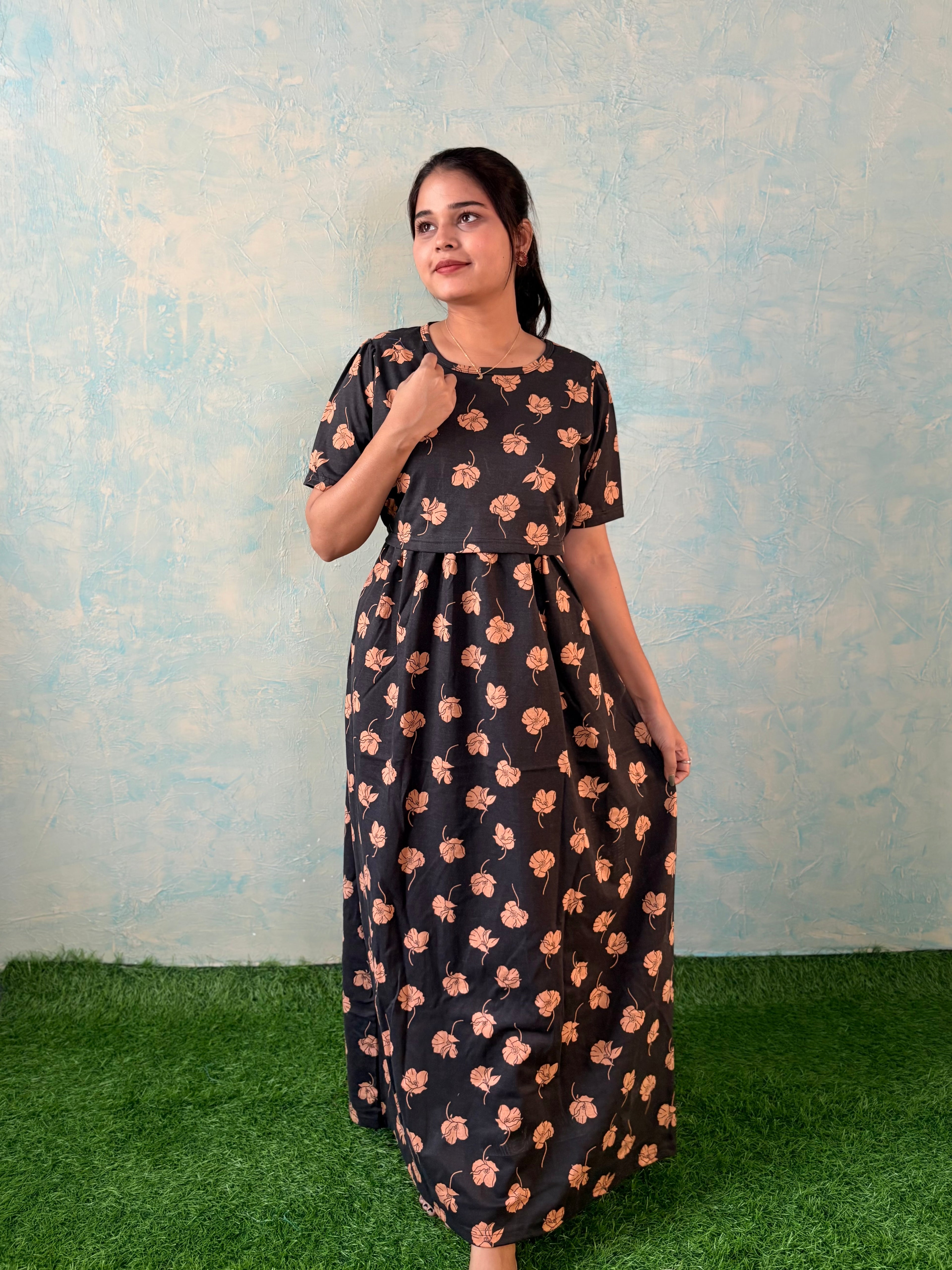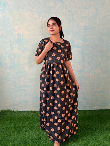 Inner feeding neck is V shape. Versatile & Stylish – Designed for both loungewear and casual outings, so you can wear it comfortably at home or when running errands. Mild colour fade is normal as we don't use synthetic dyes in the interest of Mom and baby's health. Length of the dress is 52 inches (+/-1 inch). There may be a small variation in the colour due to photography and lighting effects.