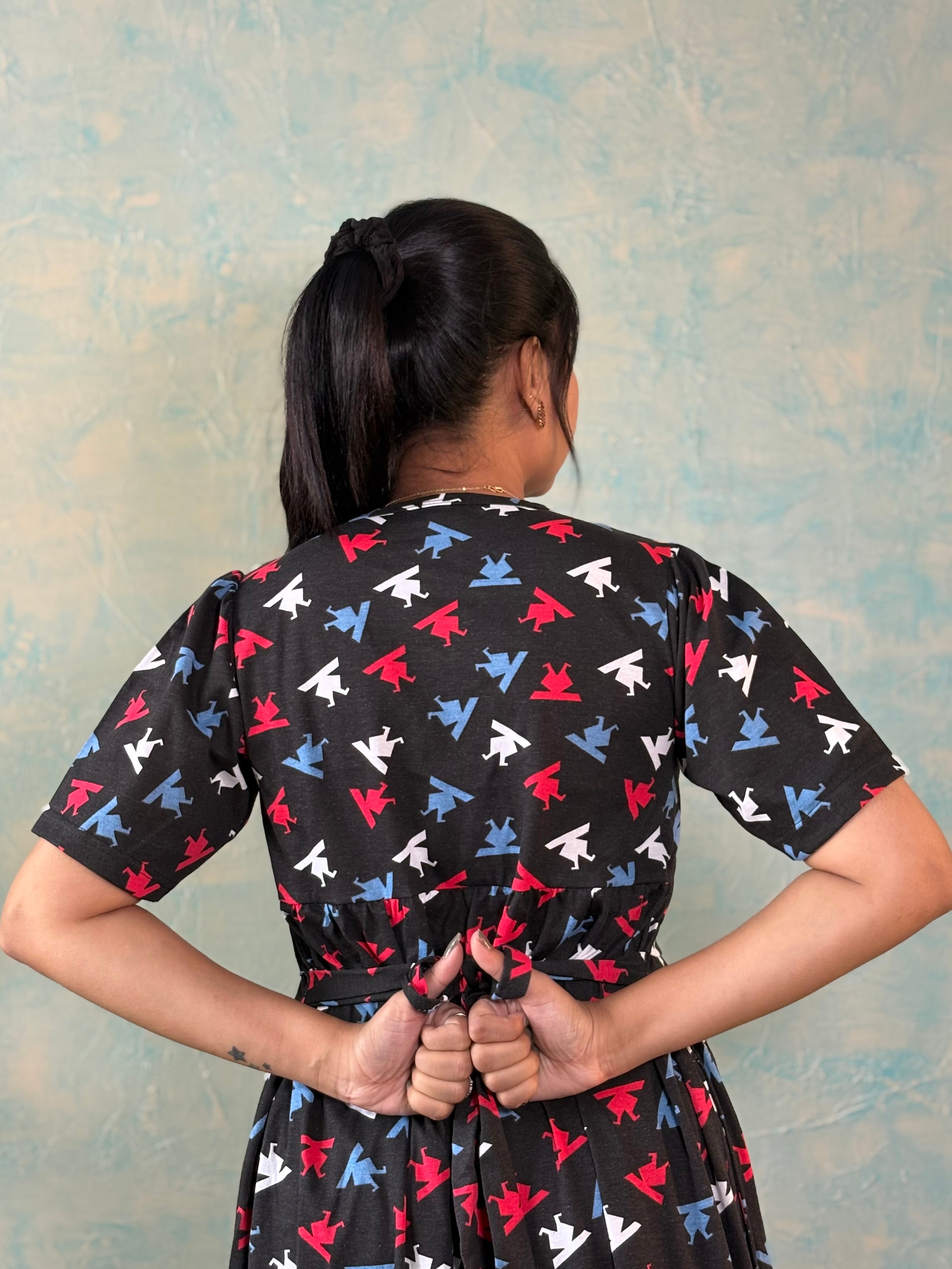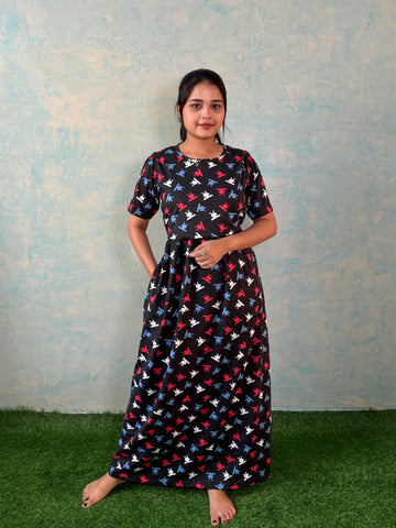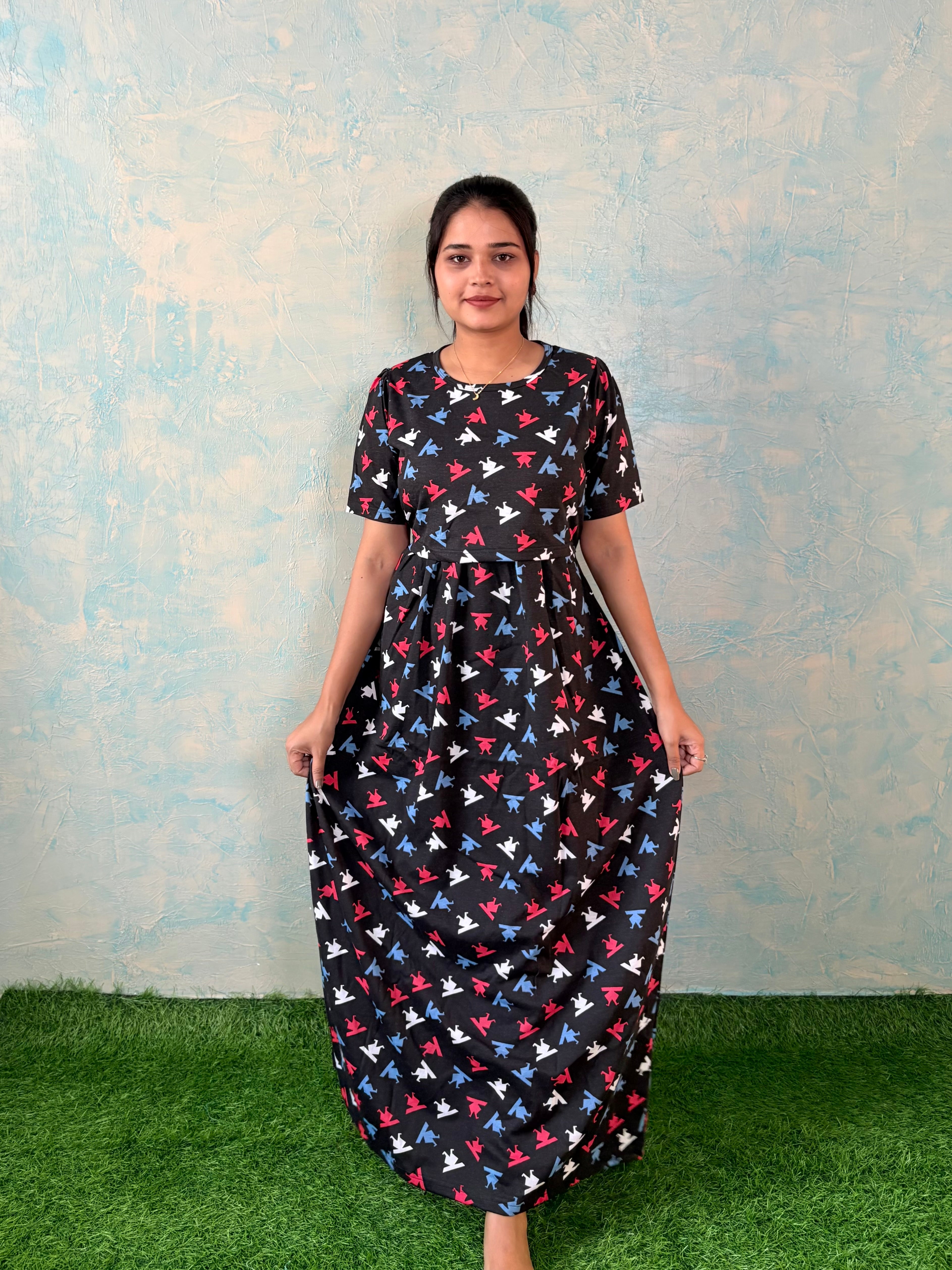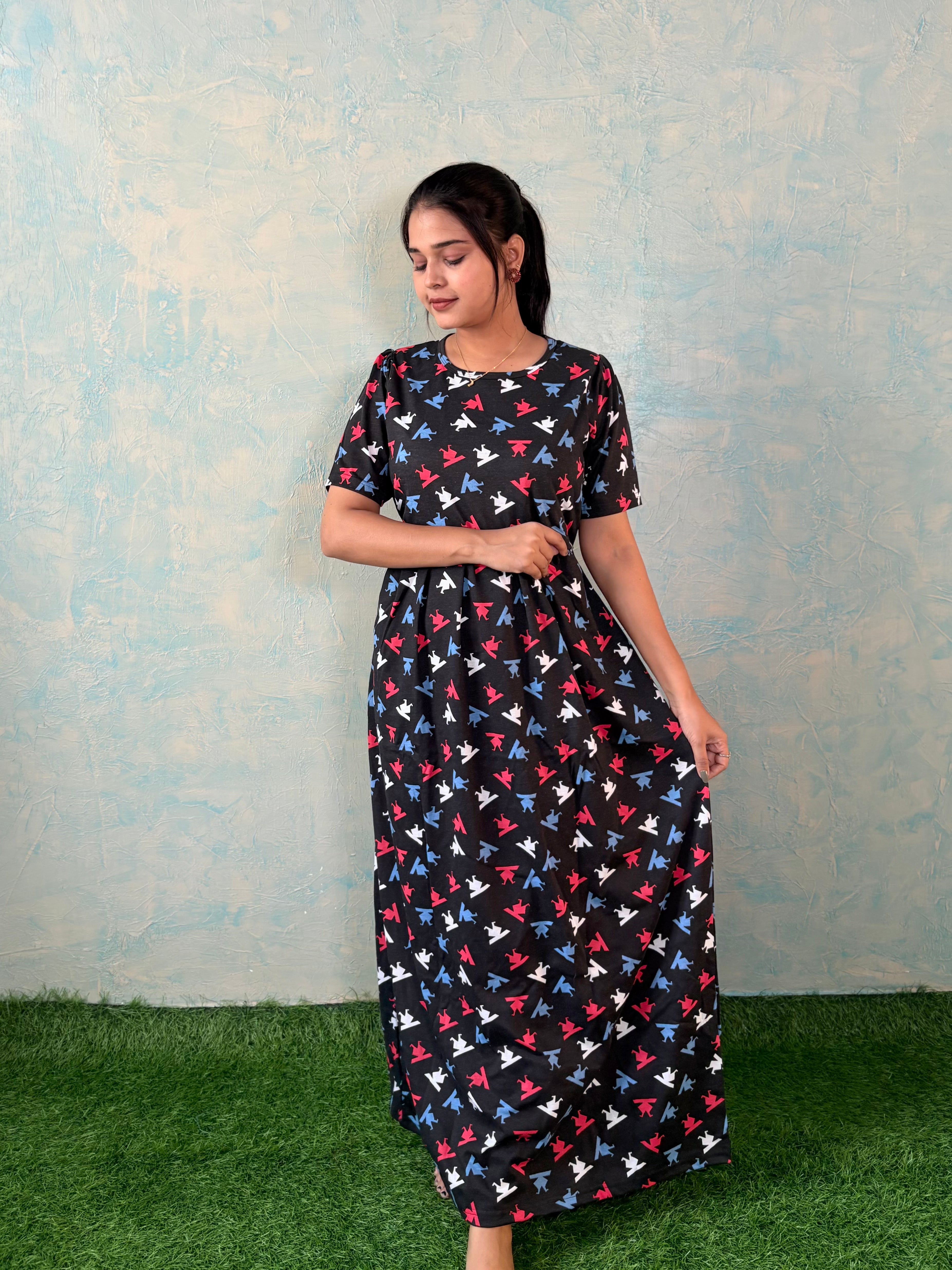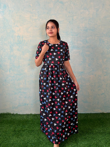 Inner feeding neck is V shape. Versatile & Stylish – Designed for both loungewear and casual outings, so you can wear it comfortably at home or when running errands. Mild colour fade is normal as we don't use synthetic dyes in the interest of Mom and baby's health. Length of the dress is 52 inches (+/-1 inch). There may be a small variation in the colour due to photography and lighting effects.