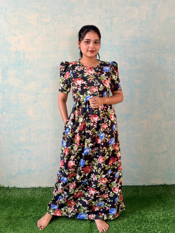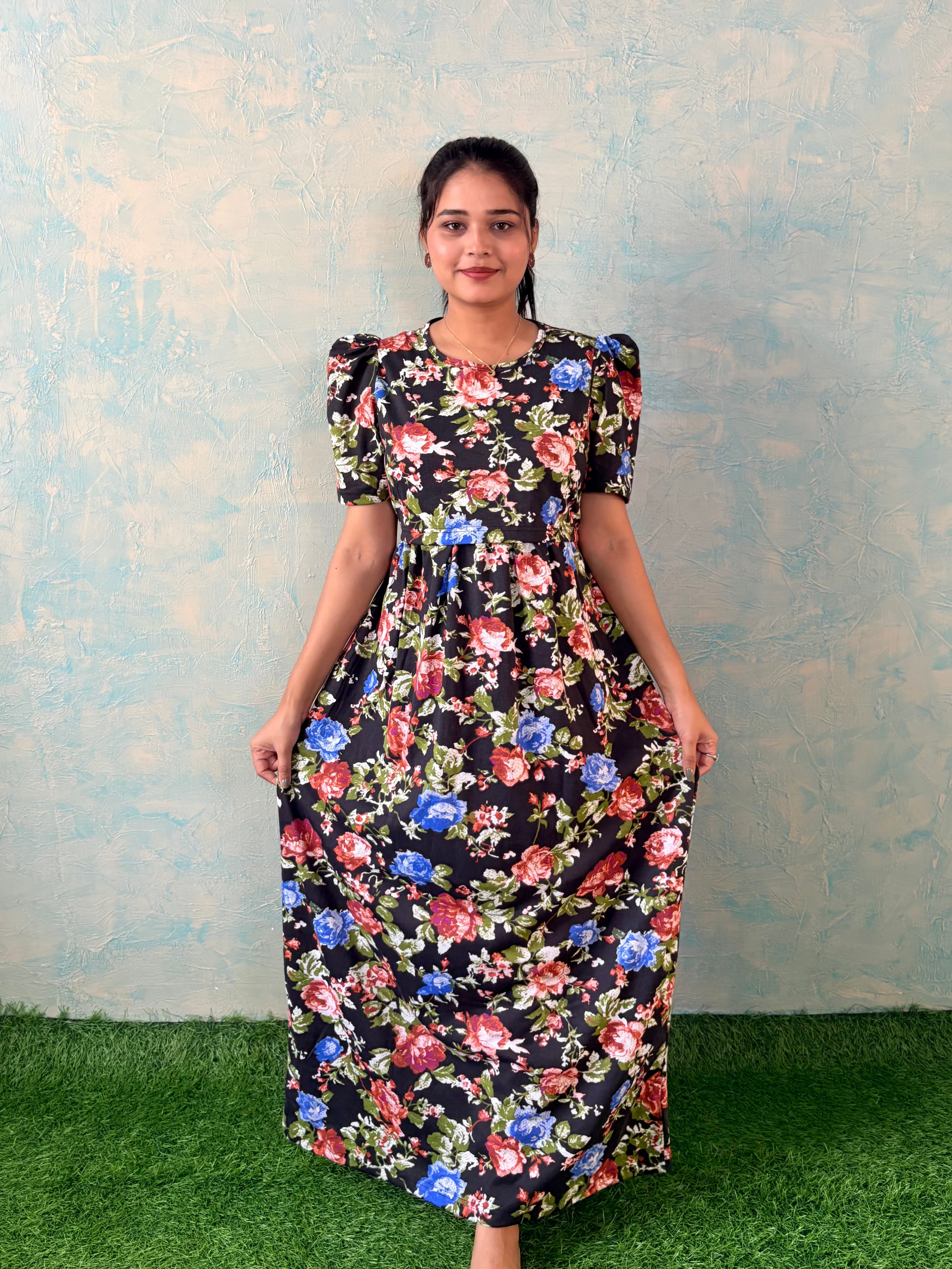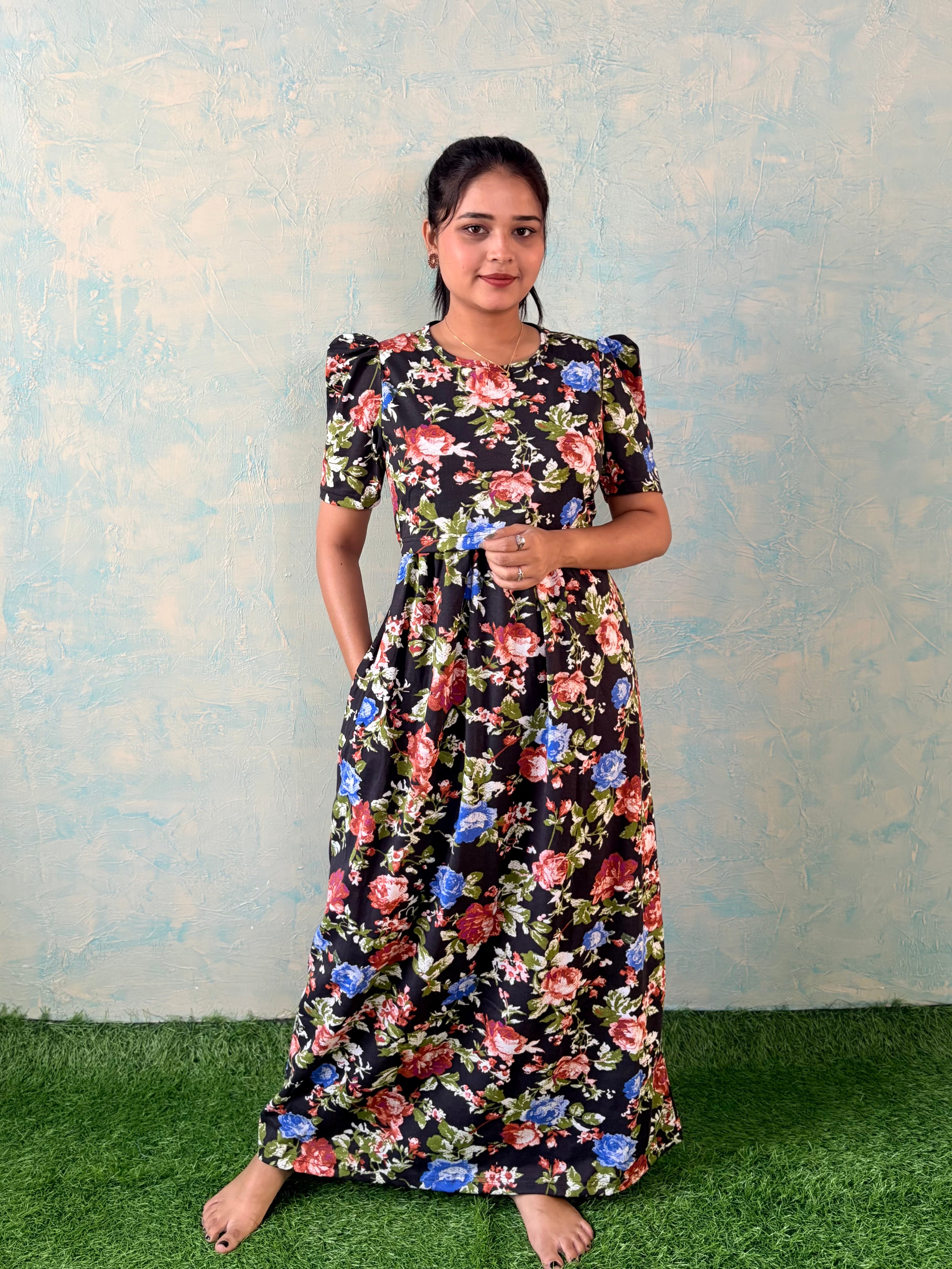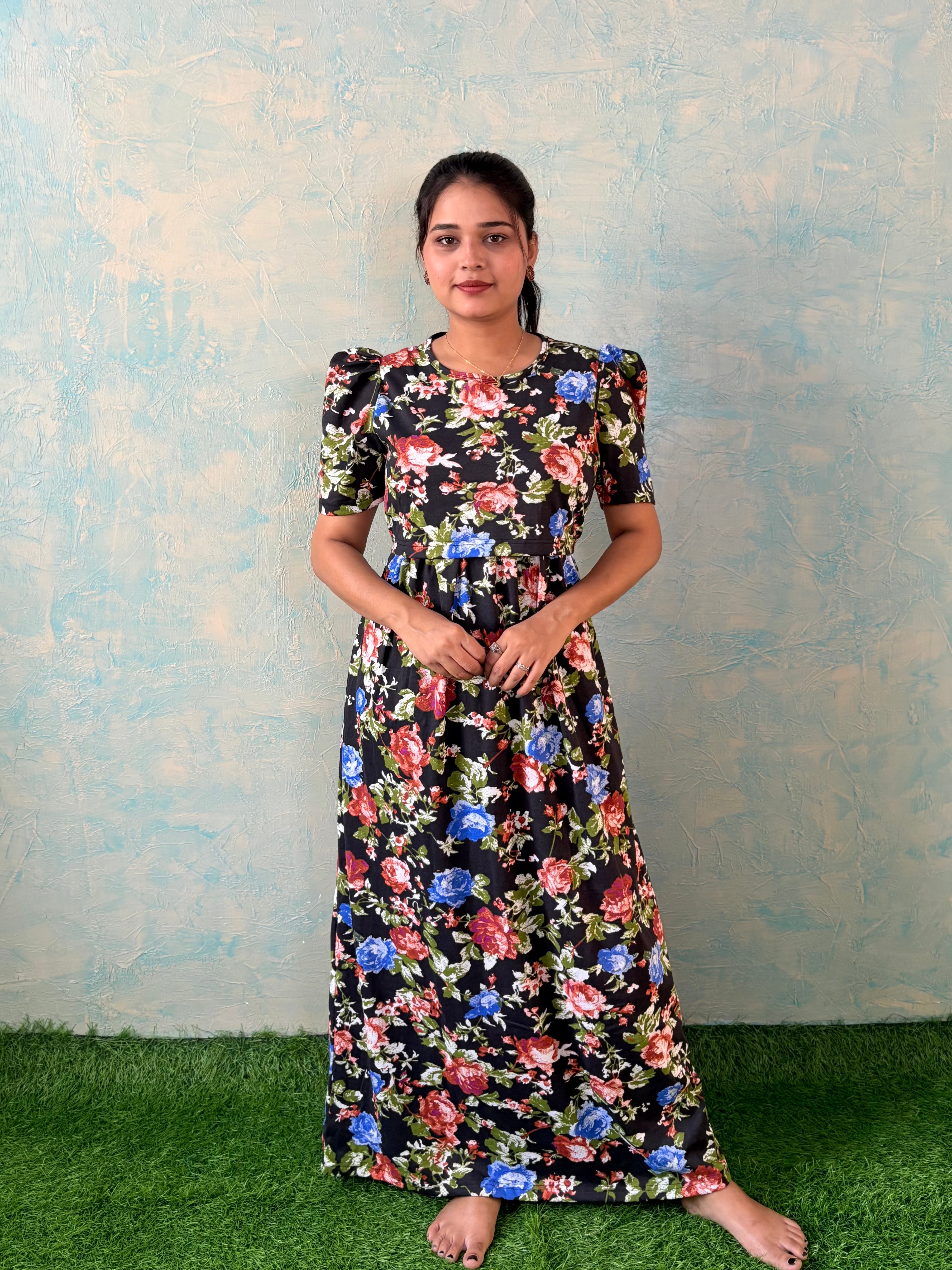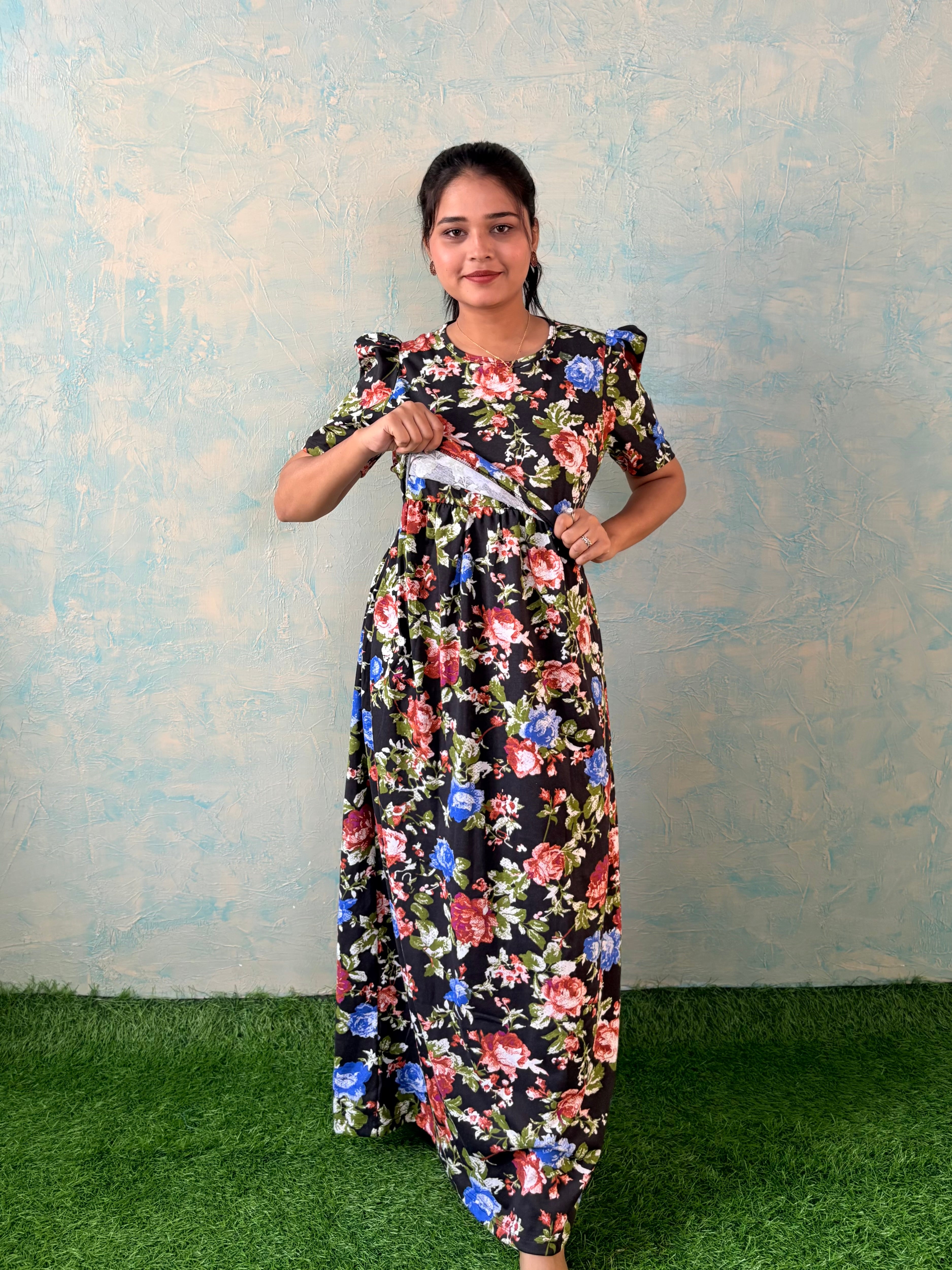 Inner feeding neck is V shape. Versatile & Stylish – Designed for both loungewear and casual outings, so you can wear it comfortably at home or when running errands. Mild colour fade is normal as we don't use synthetic dyes in the interest of Mom and baby's health. Length of the dress is 52 inches (+/-1 inch). There may be a small variation in the colour due to photography and lighting effects.