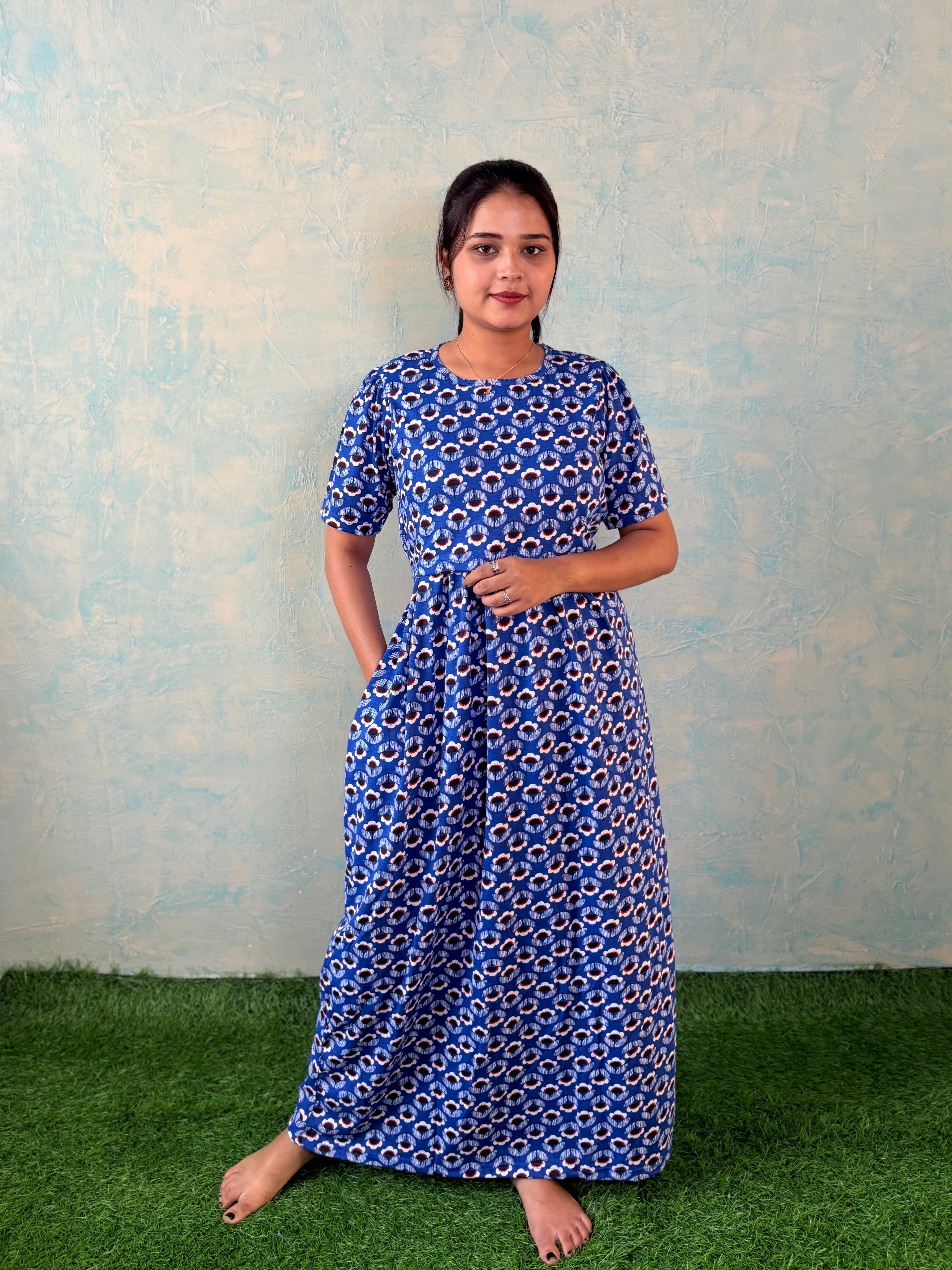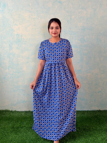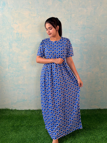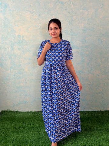 Inner feeding neck is V shape. Versatile & Stylish – Designed for both loungewear and casual outings, so you can wear it comfortably at home or when running errands. Mild colour fade is normal as we don't use synthetic dyes in the interest of Mom and baby's health. Length of the dress is 52 inches (+/-1 inch). There may be a small variation in the colour due to photography and lighting effects.