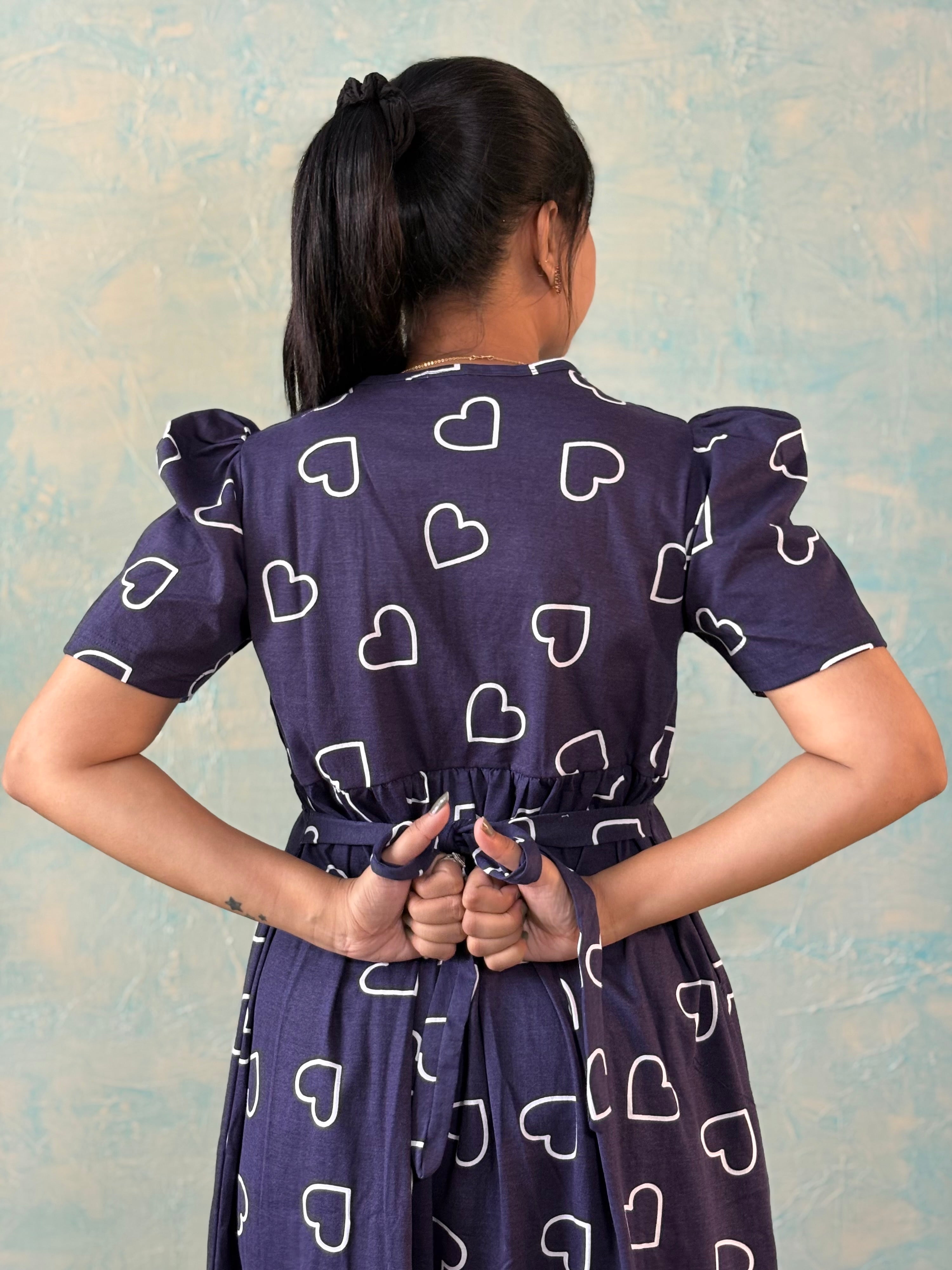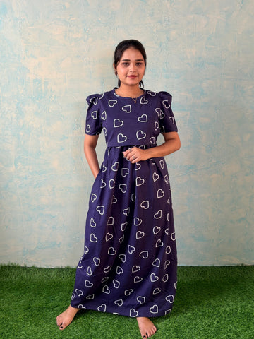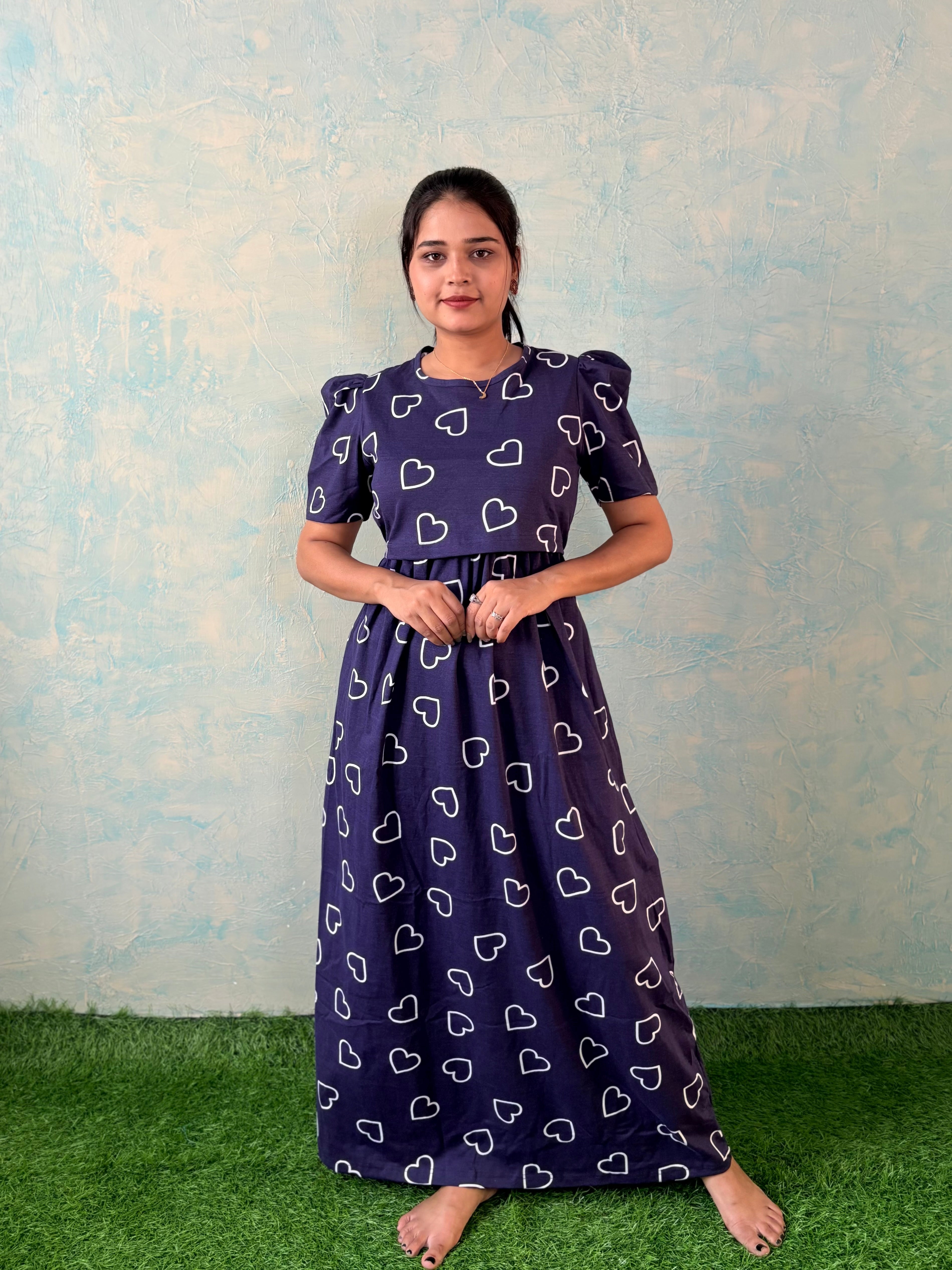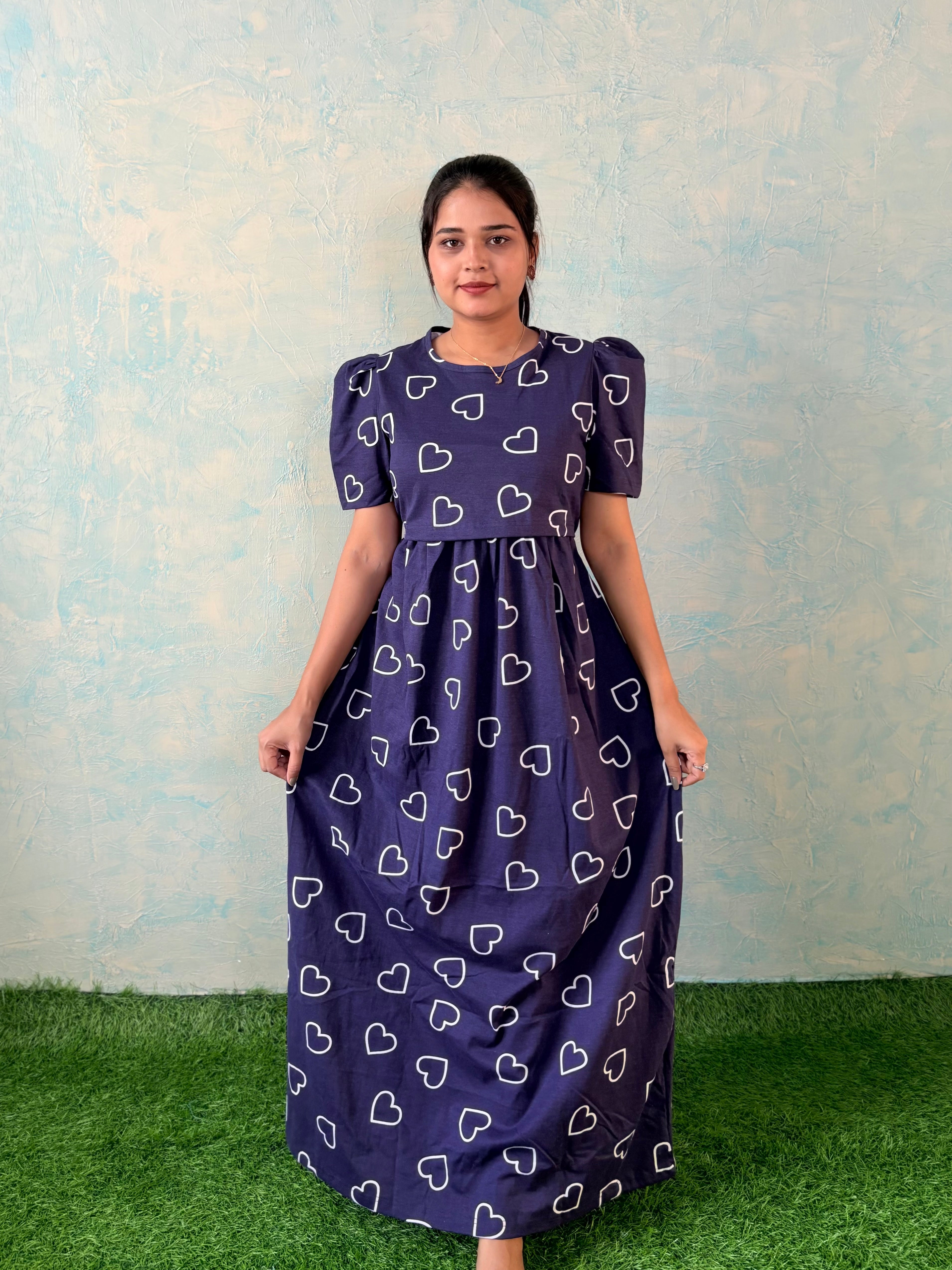 Inner feeding neck is V shape. Versatile & Stylish – Designed for both loungewear and casual outings, so you can wear it comfortably at home or when running errands. Mild colour fade is normal as we don't use synthetic dyes in the interest of Mom and baby's health. Length of the dress is 52 inches (+/-1 inch). There may be a small variation in the colour due to photography and lighting effects.