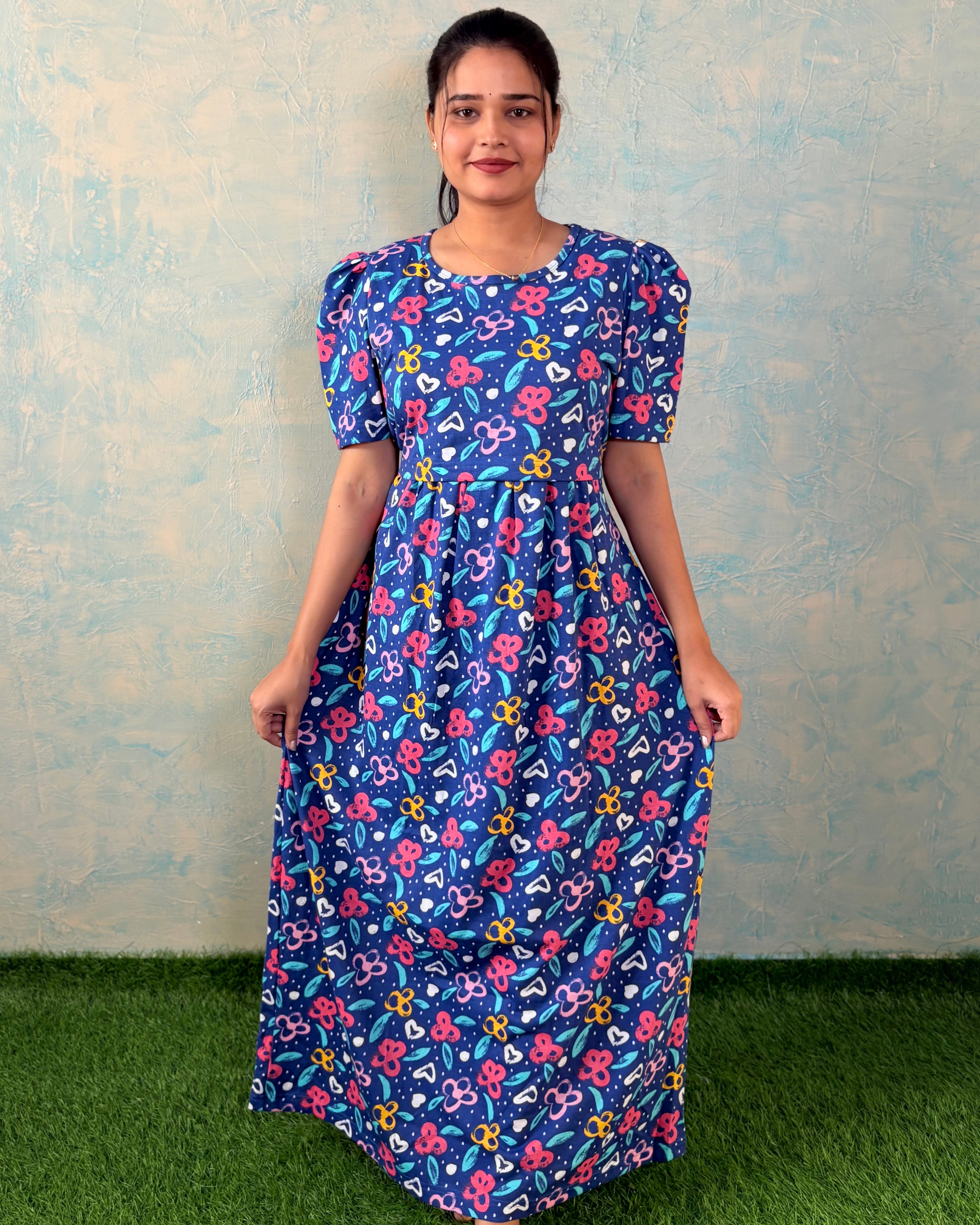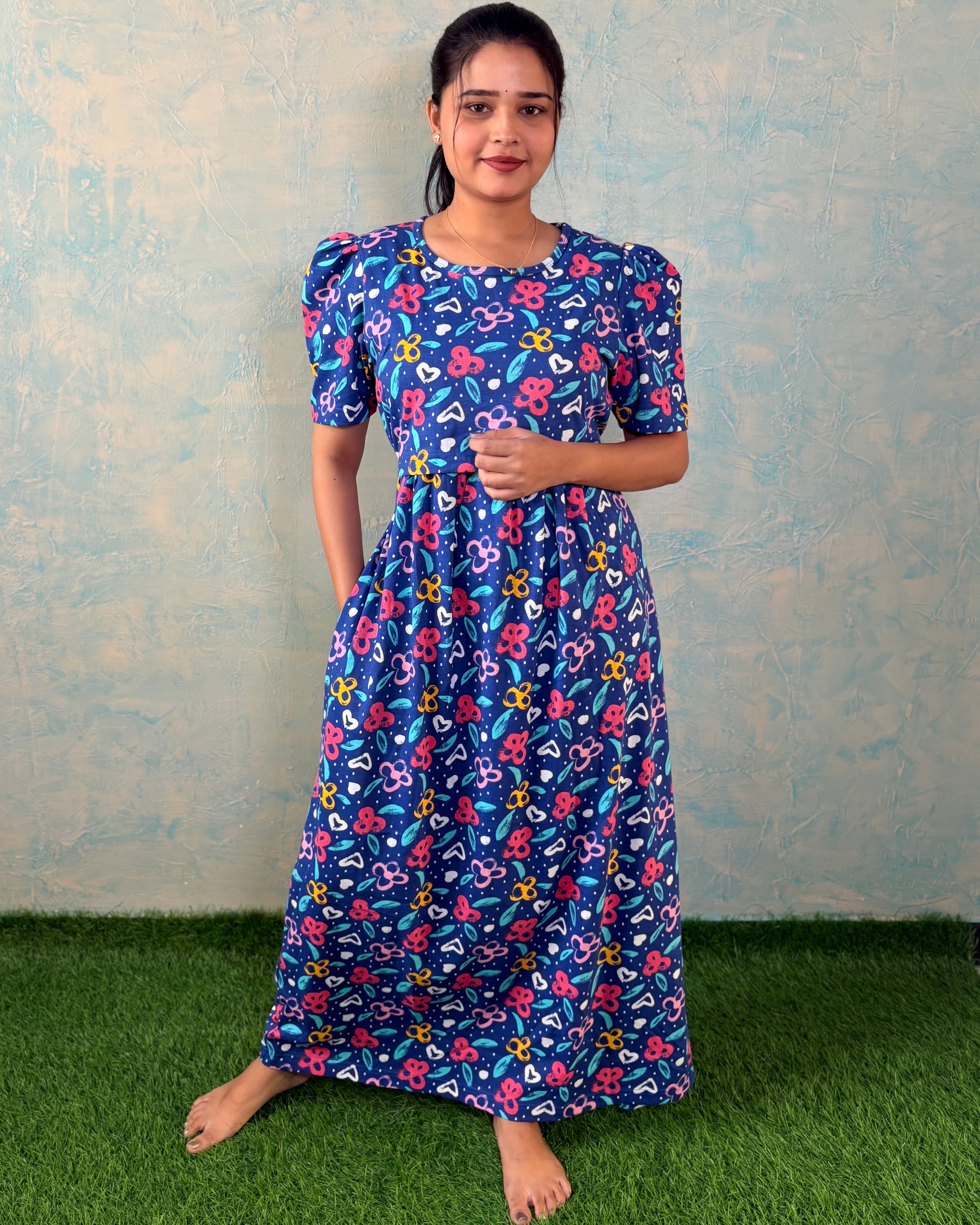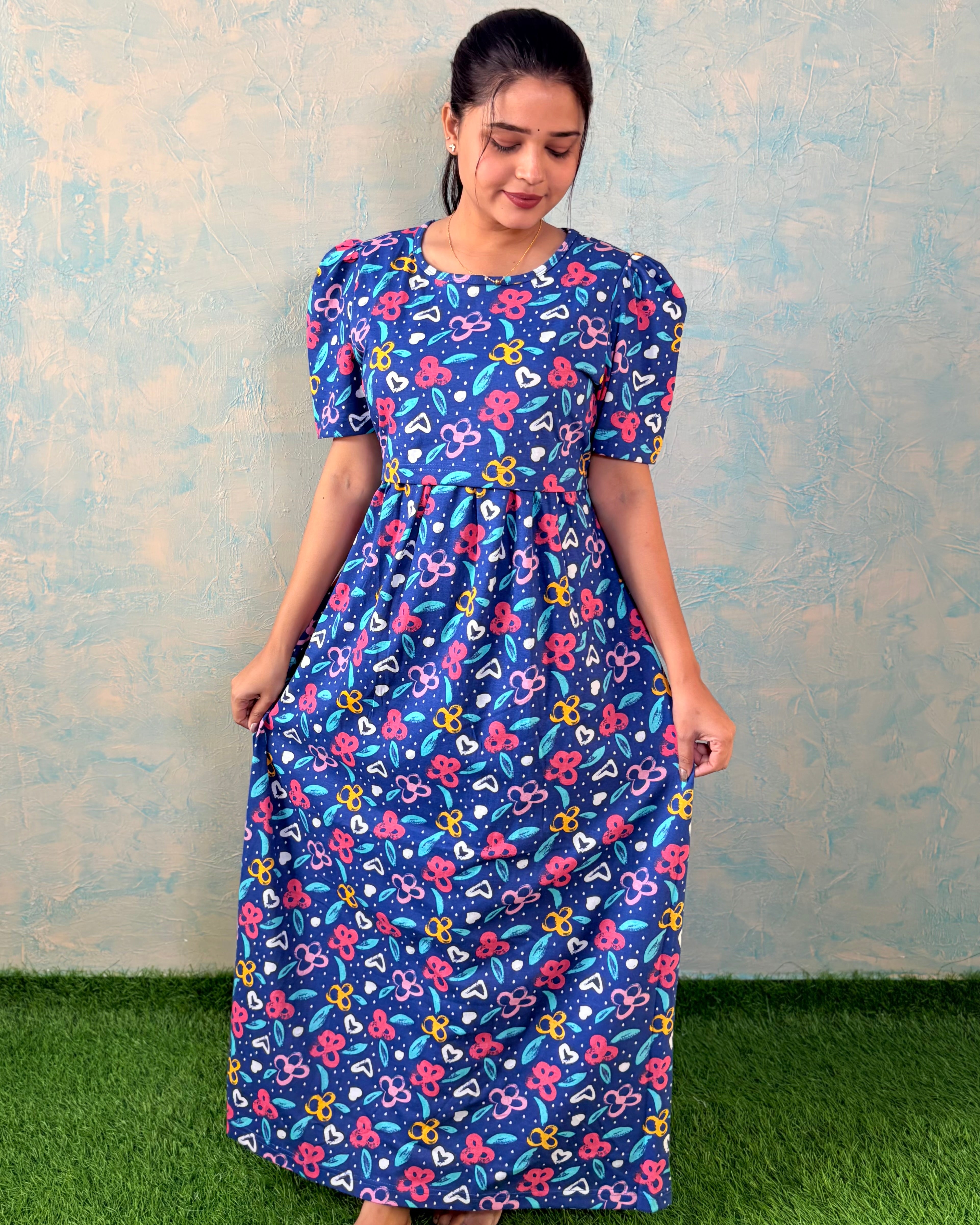 Inner feeding neck is V shape. Versatile & Stylish – Designed for both loungewear and casual outings, so you can wear it comfortably at home or when running errands. Length of the dress is 52 inches (+/-1 inch). There may be small variation in the colour due to photography and lighting effects.