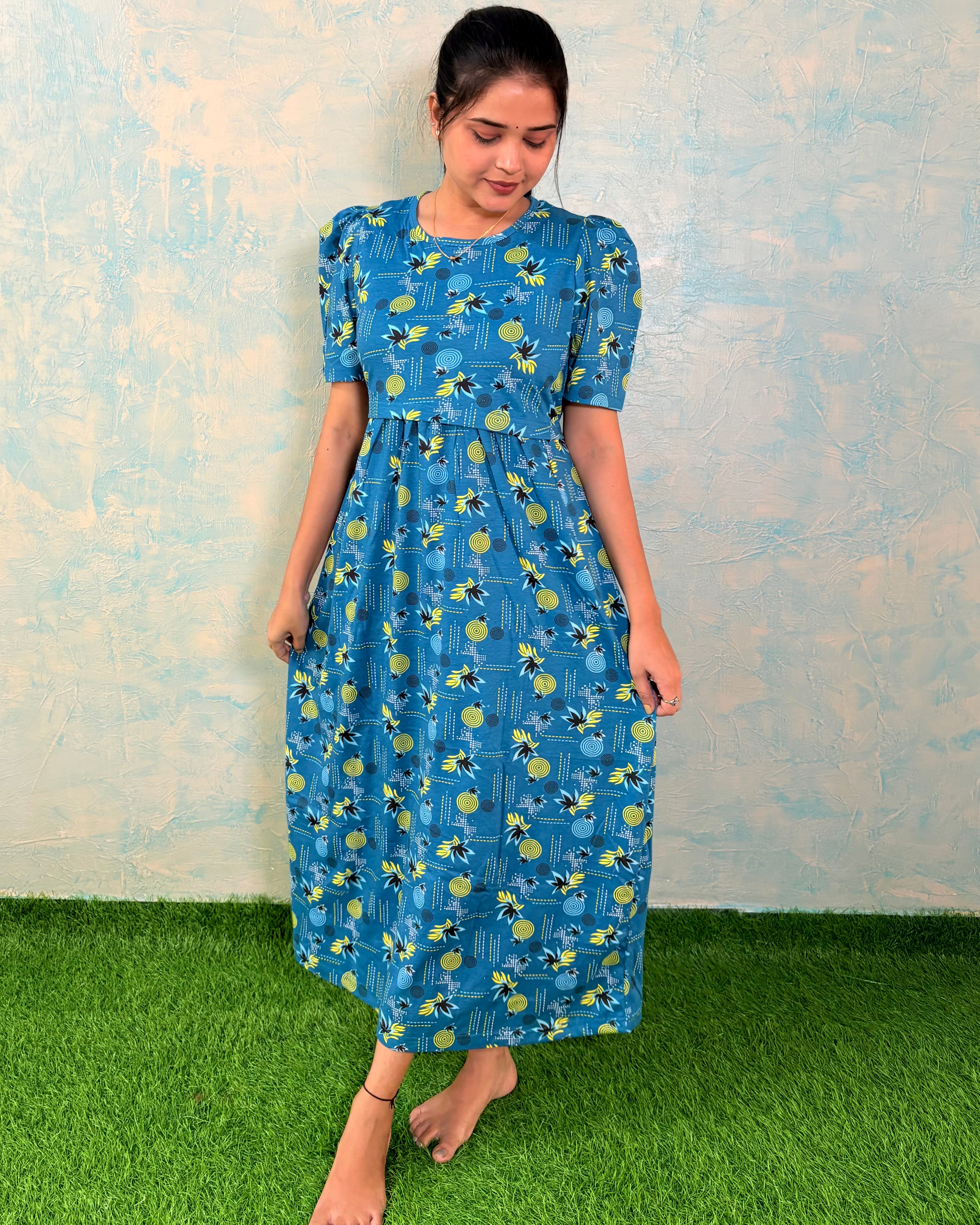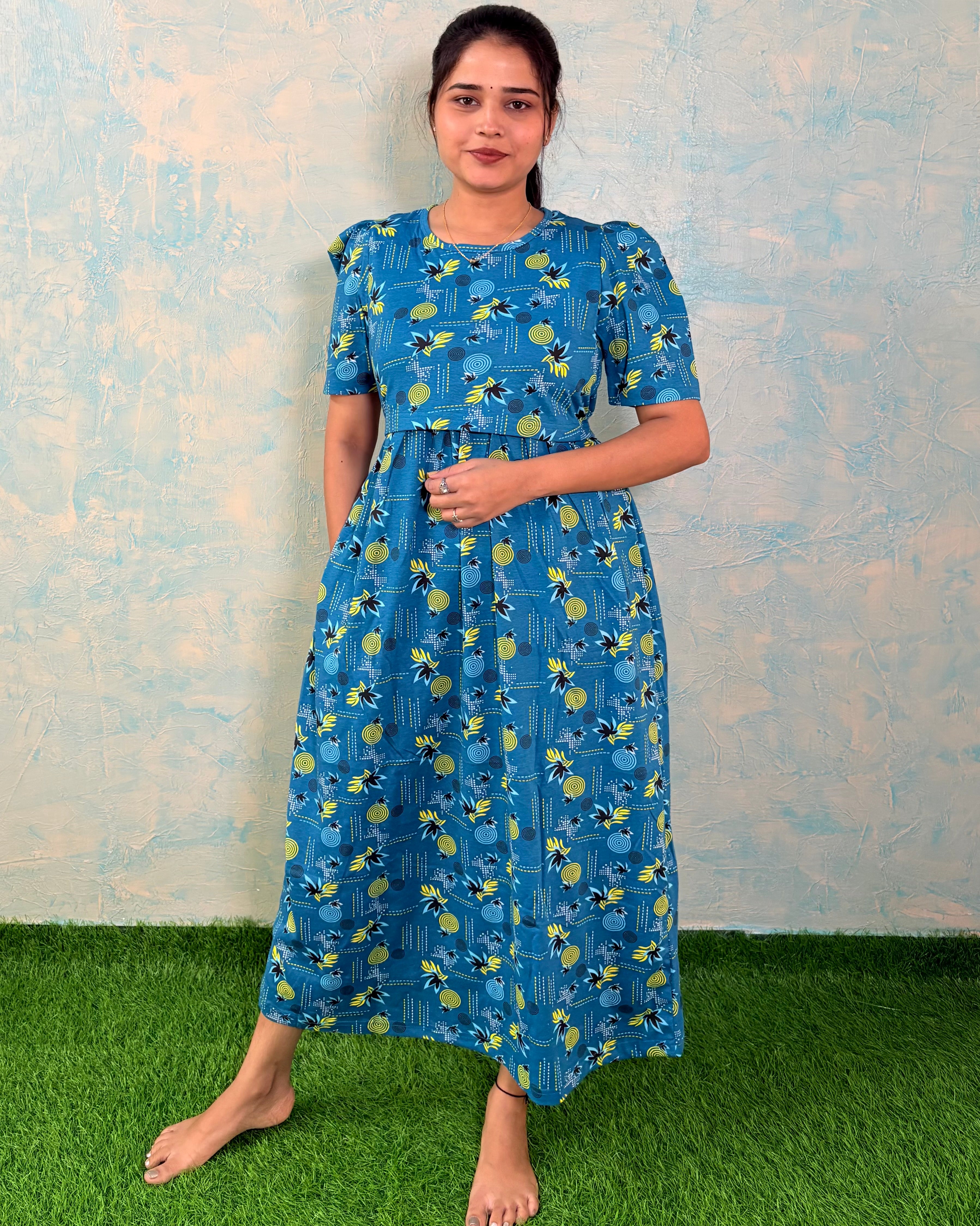 Inner feeding neck is V shape. Versatile & Stylish – Designed for both loungewear and casual outings, so you can wear it comfortably at home or when running errands. Length of the dress is 48 inches (+/-1 inch). There may be small variation in the colour due to photography and lighting effects.